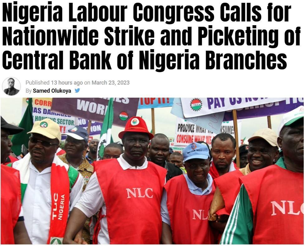 And in an article published today, March 23, 2023, it is being reported that the Nigeria Labour Congress is calling for public sector workers to start a nationwide strike next week, protesting at Central Bank branches, which could cripple the entire country. (Source.)