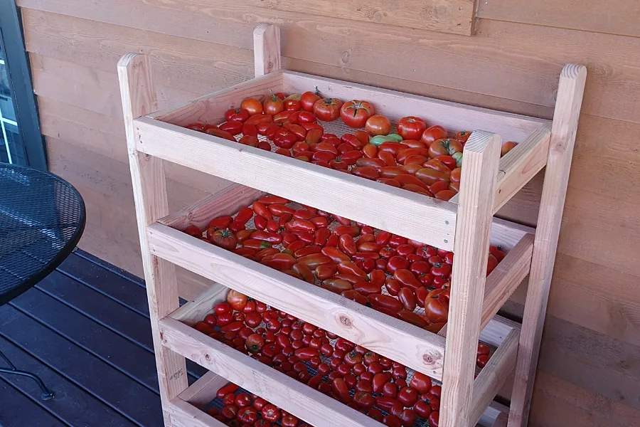 We created the rack out of hardware cloth and a few untreated 2 x 4’s. It allows the tomatoes to ripen under a bit more protection and more importantly, off the plant. The hardware cloth allows for good air flow good and lets them ripen fully on all sides. See Our 2×4 DIY Drying Rack Plans